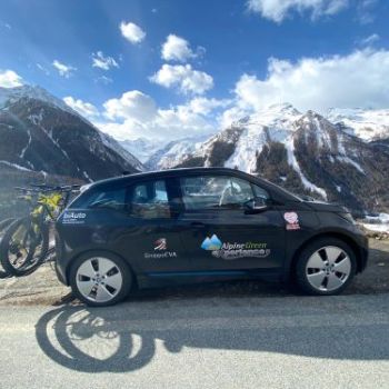 Noleggio di due e-MTB biammortizzate per la giornata intera. Noleggio di una BMW i3 elettrica con porta bike, inclusa assicurazione e ricarica elettrica.